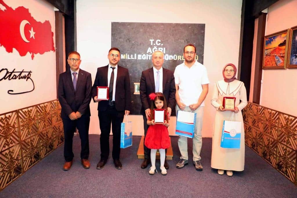 Ödül töreninde öğretmenimiz, plaketini İl Milli Eğitim Müdürü Hasan Kökrek’in elinden aldı.
